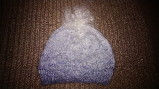Nachdem Nr 1 leider etwas zu groß war hab ich sie verschenkt und spontan am Abend schnell ne neue gemacht. 100% Angora im Knäul in Restfarbe gefärbt so das ein etwas anderer Farbverlauf entstanden ist. Mit Mohair Löckchen